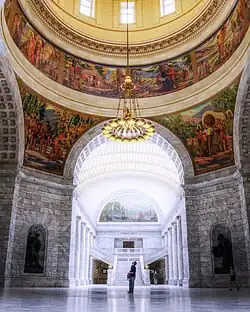 La cúpula está sostenida por arcos artesonados cubiertos de mármol, que se asientan sobre cuatro pechinas.[16] Cada uno de esos arcos representa una escena de la historia de Utah, incluida la exploración de Utah por John C. Frémont, la expedición Domínguez-Escalante, la trampa de pieles realizada por Peter Skene Ogden y, por último, la llegada de los pioneros mormones liderados por Brigham Young. En la parte inferior de las pechinas que rodean la rotonda hay nichos que contienen estatuas. Los nichos son originales del edificio, pero hasta la restauración permanecieron vacíos. Antes de las renovaciones, tres artistas, Eugene L. Daub, Robert Firmin y Jonah Hendrickson recibieron el encargo de crear estatuas para llenarlas. Las cuatro estatuas, cada una de aproximadamente 3,4 m alto y conocido colectivamente como "Los Grandes Utah" representan Ciencia y Tecnología, Tierra y Comunidad, Inmigración y Asentamiento, junto con las Artes y la Educación.[17] Suspendido del techo de la cúpula se encuentra el candelabro original que pesa 1.360 kg (La cadena que lo sostiene pesa 453 kg). El candelabro es una copia exacta de uno que cuelga en el Capitolio del Estado de Arkansas, y durante el proceso de restauración Arkansas envió varios difusores de vidrio de época a Utah para reemplazar los rotos que se encuentran en su candelabro.[18]