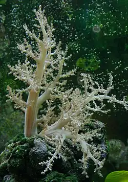 La colonia de pólipos tiene apariencia arbórea, partiendo de un pie en forma de tronco, que está anclado en su extremo a la roca o coral muerto. Este tronco está muy ramificado, con diversas bifurcaciones, que en sus extremos presentan pólipos no retraibles, a no ser que la totalidad de la colonia se vacie de agua. El color de la colonia coralina oscila entre el blanco, el marrón, el verde y el rosa suaves. En su epidermis se pueden apreciar claramente espículas calcáreas, que se conforman para dar firmeza a la estructura arbórea de la colonia.[2] La colonia alcanza los 41 cm de altura.
