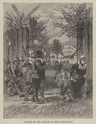 La conquista de Nuevos Países Bajos se produjo en 1664 cuando una expedición inglesa liderada por Richard Nicolls llegó al puerto de Nueva York y llevó a cabo una captura pacífica de Nueva Ámsterdam y el Fuerte Ámsterdam, y se acordaron los Artículos de Rendición de Nuevos Países Bajos. La conquista también fue mayoritariamente pacífica en el resto de la colonia, salvo algunos combates en Nueva Amstel. [1]