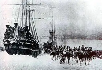 Después de haber tomado las precauciones necesarias para evitar que los cascos de los caballos despertasen a los marinos, el teniente-coronel Louis Joseph Lahure inicia el asalto. El hielo no cede, y los navíos neerlandeses son abordados por los caballos.