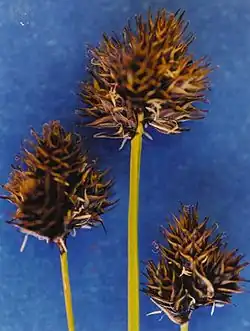 Esta juncia produce racimos de caídos a decumbentes tallos de hasta 30 o 40 centímetros de largo, a menudo mucho más cortos. Tiene algunas hojas por tallo, cada una de hasta unos 16 centímetros de largo. La inflorescencia es un denso grupo esférico de espiguillas indistintas de color marrón oscuro.