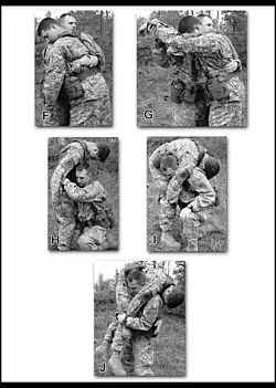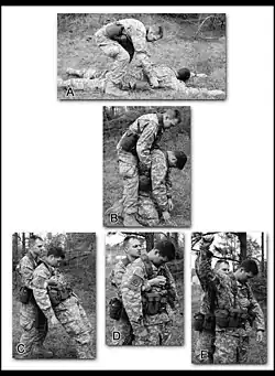 - El hecho de que el calor y el humo que pueden ser dañinos, incluso fatales para la persona a rescatar, aumenten con la altitud, habla en contra de un uso posterior por parte de los bomberos.[2]Steps A to ESteps F to JLa técnica de "transporte de bombero" ilustrada en un manual de entrenamiento del ejército de EE. UU.