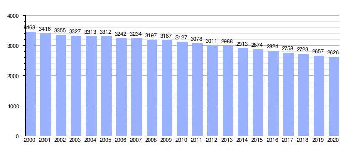 | Gráfica de evolución demográfica de Cariño (parroquia y villa) entre 2000 y 2020 |