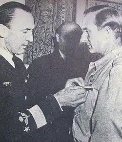 Carl Gustaf von Rosen (derecha) recibiendo una condecoración de manos de Bengt Nordenskiöld | ||