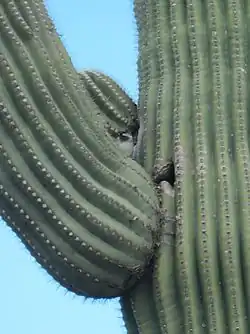 Los pájaros carpinteros de Gila (Melanerpes uropygialis) y los carpinteros dorados (Colaptes chrysoides) crean agujeros en el tallo del cactus para hacer nidos, que luego son utilizados por otras aves, como los búhos enanos (Micrathene whitneyi), las golondrinas purpúreos (Progne subis) y los camachuelos mexicanos (Haemorhous mexicanus). Los carpinteros dorados excavan agujeros más grandes en comparación con los pájaros carpinteros de Gila. La cavidad del nido resultante es profunda y los padres y las crías quedan completamente ocultas a la vista.