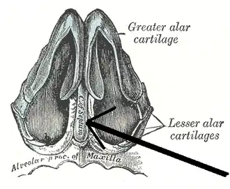 Su margen anterior es más grueso en su parte superior y está conectado con los huesos nasales. El mismo se continúa con los márgenes anteriores de los cartílagos laterales y posteriormente, se conecta mediante tejido fibroso con los pilares mediales de los principales cartílagos alares.