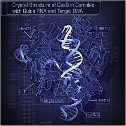 - ↑ Nishimasu H; Ran FA; Hsu PD; Konermann S; Shehata SI; Dohmae N; Ishitani R; Zhang F et al. (Feb 2014). «Crystal structure of Cas9 in complex with guide RNA and target DNA». Cell 156 (5): 935-49. PMC 4139937. PMID 24529477. doi:10.1016/j.cell.2014.02.001.