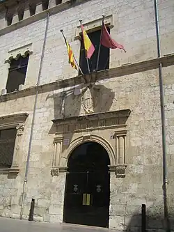 En fachada, la planta baja presenta motivos renacentistas, mientras que la planta principal presenta ventanales góticos. Esto ha llevado a pensar en la posibilidad de que estos ventanales sean una reutilización de otro edificio. Se trata de un fachada simétrica, donde la planta baja presenta una portada central de arco de medio punto con dos ventanas adinteladas a sus lados.