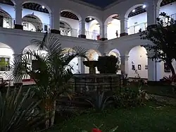 En su interior el conjunto arquitectónico presenta dos patios, el principal de planta cuadricular exhibe un patio con jardinera con una pequeña fuente central circular. El patio secundario de mayores dimensiones de planta rectangular posee una explanada donde se exhiben las diferentes actividades culturales que ahí se realizan. El inmueble posee entre sus escaleras, una escalera de cantera de dos rampas con bóvedas de crucería, en sus muros se exhiben diversas galerías realizadas por estudiantes de dicha institución.