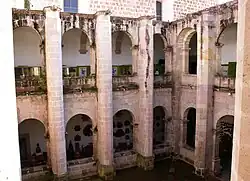 En su interior posee dos patios; el principal de planta cuadrangular presenta arquerías de medio punto presididas por contrafuertes, sus corredores circundantes se hallan techados con bóvedas de lunetos. Las distintas salas se distribuyen a su alrededor y presentan bóvedas de cañón o techos de viguería de madera. El patio secundario de planta cuadrangular es austero y se encuentra presido por muros de cantera donde se asoman algunas ventanas rectangulares. El cubo de la escalera principal de cuatro rampas se halla techado con una bóveda de pañuelo donde están trazados casetones.