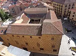 El estilo gótico tardío se combina con los nuevos aires del plateresco renacentista. Comienza a construirse hacia 1493 y su edificación concluyó en 1517. Hacia 1701 la casa se repara y amplía, apareciendo la fachada que da hacia la Rúa. Fue después cárcel del estudio, es decir, cárcel de la Universidad. En 1929 se declara Monumento Nacional. En 1967 es cedida al Ayuntamiento de Salamanca, mediante un contrato de arrendamiento por un valor simbólico de una peseta de oro anual durante noventa y nueve años por Enrique de Queralt y Gil Delgado, conde de Santa Coloma[1] En 1970 el Ministerio de Cultura se subroga al acuerdo y sigue con el arrendamiento. Desde 1993 y tras una larga restauración, alberga en su interior una Biblioteca Pública del Estado. En 1997 su propietario, el conde de Santa Coloma, Enrique de Queralt y Chávarri, entregó el inmueble a la Junta de Andalucía como pago de impuestos. En 2005 la Junta de Andalucía lo permutó por otro edificio con el Estado, su actual propietario.