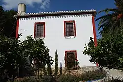 Conserva un edificio principal de dos plantas, encalado en blanco al exterior con cornisas, esquinas, ventanas y puertas enmarcadas en una franja granate, y en el que residían los propietarios de la finca. Las ventanas conservan el enrejado de hierro original.