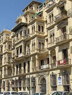 Destacan el uso de rejería en los balcones superiores que comparte los modelos de rejería del siglo XIX tan habituales en otras zonas de la ciudad. También es interesante la profusa decoración de la fachada que remite a modelos neoplaterescos y el empleo de la cerámica.