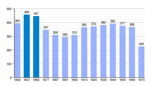 | Gráfica de evolución demográfica de Casasana[5] entre 1842 y 1970 |