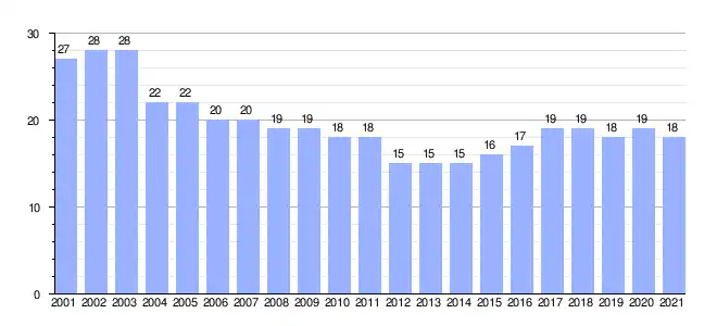 | Gráfica de evolución demográfica de Casasola de la Encomienda[8] entre 2001 y 2021 |