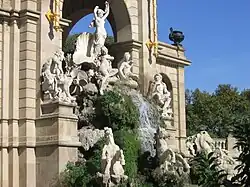 | Nacimiento de Venus | Venancio y Agapito Vallmitjana (diseño), Eduard B. Alentorn (realización) | Mármol blanco | 4,86 x 3,94 x 3,12 m | Es el motivo principal del conjunto, que representa el nacimiento de la diosa Venus. La diosa se halla de pie con los brazos en alto, enmarcada por una concha marina y dos náyades a sus pies. Este grupo se alza sobre un conjunto irregular de rocas de donde brota el primer surtidor de la cascada. Debajo hay cuatro caballos marinos, con medio cuerpo de caballo y medio de pez, que parecen conducir un carruaje imaginario, efecto calcado de la obra de Henri Espérandieu en Marsella. El diseño de los Vallmitjana —realizado mayormente por Venancio— se centró en la frontalidad del grupo, ya que el monumento está diseñado para ser visto de frente, así como en su monumentalidad, ya que debía ser visto de lejos. El ejecutor de la obra, Eduard B. Alentorn, añadió unos elementos vegetales a la parte posterior del grupo, visible al subir las escalinatas, así como dos grandes hélices, en alusión a los barcos y la importancia marítima de Barcelona.[10] | |