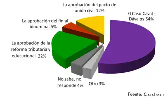 - ↑ «Cadem: Un 54% dice que gobierno de Bachelet será recordado por Caso Caval por sobre las reformas». www.latercera.com. 20 de abril de 2015. Archivado desde el original el 21 de abril de 2015. Consultado el 20 de abril de 2015.