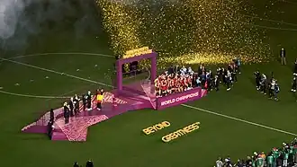 La final de la Copa Mundial Femenina de Fútbol se disputó en el Stadium Australia de Sídney entre las selecciones de Inglaterra y España. A los 29 minutos desde el inicio del choque, la española Olga Carmona anotó el único gol del partido. El tanto fue celebrado por Luis Rubiales, presidente de la Real Federación Española de Fútbol (RFEF), de forma eufórica y llevándose la mano derecha a los genitales, mientras compartía el palco de honor con Letizia Ortiz, reina de España, su hija, la infanta Sofía[15] menor de edad de 16 años, y el presidente de la FIFA, Gianni Infantino.[16] Tras la victoria, las jugadoras del equipo español recibieron las medallas como campeonas mundiales; durante la ceremonia Rubiales abrazó mutua y efusivamente a algunas futbolistas, llegando incluso a dar un beso en la boca a Jenni Hermoso, tras cogerle la cabeza con ambas manos,[2] lo que ha sido calificado de beso forzado.[3][17]
