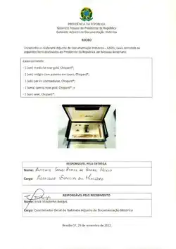 - ↑ Rodrigues, Elijonas Maia, Larissa. «Inquérito da PF irá apurar descaminho e peculato em caso das joias trazidas ao Brasil». CNN Brasil (en portugués de Brasil).