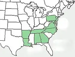 En bosques mixtos de suelos arenosos.[3] Nativa y endémica de Estados Unidos (Maryland, Carolina del Norte, Tennessee y Virginia)[4]