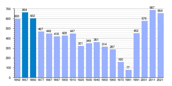 | Gráfica de evolución demográfica de Castellanos de Villiquera[11] entre 1842 y 2021 |