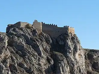La muralla conservada se encuentra jalonada por una treintena de almenas, algunas presentan terminación en punta de diamante, y hasta diez saeteras. Así mismo cuenta con puerta de acceso pero no dispone de torre del homenaje ni de torres de flanqueo. El interior del castillo, lo poco que queda, muestra un aspecto quebrado e irregular en altura.