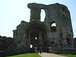 La entrada principal estaba muy reforzada con tres torres octagonales y un puente levadizo: dos de las torres daban hacia el exterior, y la tercera al interior (la Torre Badnes). Esta gran torre de forma triangular creaba un pasadizo fuertemente defendido con agujeros por donde arrojar cosas, rastrillos en serie, dos puertas de madera, y ventanas por donde disparar flechas. Una de las torres de la puerta encerraba los aposentos del portero y otra la prisión.