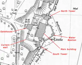 El muro cortina está rodeado por un foso seco que originalmente tenía cerca de 10 m de ancho por 5,5 m de profundidad, aunque desde entonces se ha ido llenado parcialmente. Los visitantes del castillo cruzaban un puente levadizo, que ya no existe, para llegar a la entrada. En la pared norte existe una entrada secundaria al castillo. En el interior del muro cortina todavía se pueden ver los cimientos de ladrillo de los edificios. Estas fueron originalmente estructuras inclinadas, construidas en el siglo XVII para proporcionar instalaciones de almacenamiento para la guarnición.[13]