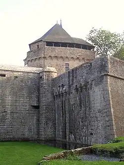 Concebida como una fortaleza en el contexto de la lucha por la independencia del ducado de Bretaña, el sistema defensivo del castillo está compuesto de siete torres, unidas por murallas y un camino de ronda. En el patio un conjunto de edificios residenciales construidos en piedra de toba, contrastan con su blancura y refinamiento con las murallas exteriores.