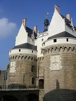 - Las torres de la Palanca y la Panadería: estas torres gemelas datan de 1466, año de construcción del castillo por Francisco II. Encuadran y protegen la entrada principal por el puente de piedra. La torre de la Panadería porta la armas de la duquesa, un escudo de armiño, coronado con la corona ducal. Está también escrita una divisa «Amavi» (quise, en latín). Se trata de una declinación libre (tardía) de la divisa de los duques de Bretaña Monfort y de la orden del Armiño « À ma Vie ». La divisa personal de Ana de Bretaña en calidad de reina de Francia es la fórmula bearnesa «Non mudera», sin variación. En cuanto a la divisa personal de su padre Francisco II, se piensa que había elegido el escrito epicúreo grabado en el interior de una joya de su tesoro «Il n'est trésor que de liesse» (No hay tesoro como la alegría).