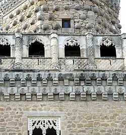 A Guas se deben los elementos gótico isabelinos del edificio, entre los que destacan la galería meridional, el patio porticado, los caballeros que rematan las torres angulares y la decoración tanto de la coronación como del saledizo del adarve.[16]