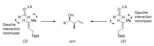 La reacción aldólica de Mukaiyama y la reacción de Sakurai se refieren a la adición de éteres de silil enol y alilsilanos a compuestos carbonílicos, respectivamente. Solo bajo la catálisis con ácido de Lewis, estas reacciones ocurren bajo condiciones sintéticamente útiles. Se cree que los estados de transición acíclicos operan en ambas reacciones para la adición de 1,2 o 1,4, y los factores estéricos controlan la estereoselectividad. Esto contrasta con el rígido estado de transición cíclica de Zimmerman-Traxler que ha sido ampliamente aceptado para la reacción aldólica con enolatos de litio, boro y titanio. Como consecuencia, la geometría del doble enlace en el silil enol éter o el alilsilano no se traduce bien en la estereoquímica del producto. Un modelo para la adición 1,2 de Sakurai, propuesto por Kumada, se presenta en el siguiente esquema;[9] el diastereómero syn es predominante cuando se usa el silano (E), y también se favorece ligeramente cuando se usa el silano (Z). Un análisis similar realizado por Heathcock[10] explica el hecho de que, con sustratos simples, esencialmente no hay diastereoselectividad para la reacción almolica intermolecular de Mukaiyama.