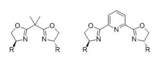 Los ligandos de bisoxazolina quiral (BOX) más comunes consisten en dos restos de oxazolina quiral idénticos, sustituidos por un grupo voluminoso en las posiciones 4, unidos por un enlazador. El ligando es bidentado cuando el enlazador es una sola unidad de carbono, pero es tridentado (generalmente meridiano) cuando el enlazador tiene un átomo de coordinación adicional, como un nitrógeno piridina en el caso de los ligandos de PyBOX. El impacto de la denticidad del ligando y la geometría intermedia activa en el resultado estereoquímico se ha revisado exhaustivamente.[32]