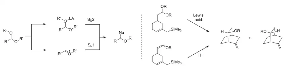 En reacciones con mecanismos polares, la catálisis ácida de Lewis a menudo implica la unión del catalizador a los heteroátomos básicos de Lewis y la extracción de densidad electrónica, lo que a su vez facilita la escisión del enlace heterolítico (en el caso de la reacción de Friedel-Crafts) o activa directamente el sustrato hacia el ataque nucleofílico ( en el caso de reacciones de adición de carbonilo). La dicotomía puede tener consecuencias importantes en algunas reacciones, como en el caso de las reacciones de sustitución de acetales promovidas por el ácido de Lewis, donde los mecanismos SN1 y SN2 que se muestran a continuación pueden dar diferentes resultados estereoquímicos. Al estudiar la relación del producto en un sistema bicíclico, Dinamarca y sus colegas demostraron que ambos mecanismos podrían estar operativos dependiendo de la denticidad del ácido de Lewis y la identidad del grupo R'.[4]