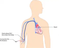 Un catéter central insertado periféricamente, o línea PICC (pronunciado "pico"), es un catéter venoso central insertado en una vena del brazo (a través de las venas basílica o cefálica) en lugar de una vena en el cuello o el pecho. La vena basílica suele ser un mejor objetivo para la canulación que la vena cefálica porque es más grande y recorre un trayecto más recto a través del brazo. La punta del catéter se coloca en la vena cava superior.[1] Los catéteres PICC tienen un diámetro más pequeño que los catéteres centrales, ya que se insertan en venas periféricas más pequeñas y son mucho más largos que los catéteres venosos centrales (50-70 cm frente a 15-30 cm). Por lo tanto, la velocidad del flujo de líquido a través de las líneas PICC es considerablemente más lenta que las líneas centrales, lo que las hace inadecuadas para la reanimación rápida con líquidos de gran volumen. Los PICC se pueden ocluir fácilmente y no pueden usarse con dilantin IV.[36]