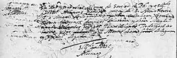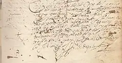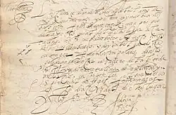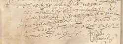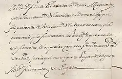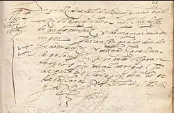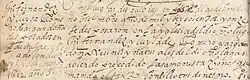 “En el Lugar de Esquivias a tres días del mes de noviembre año de mill y quinientos y noventa y siete años Juan Hidalgo teniente beneficiado babtizo a Philipa hija de Pedro de Sobarzo y de Ysabel Gardoña su muger fueron sus conpadres Fernando de Salazar Vozmediano y doña Catalina de Salazar su ermana encargoseles el parentesco spiritual testigos Antonio de Vivar Salazar y Francisco Marcos vezinos del dicho lugar y lo firme” Juan Hidalgo.