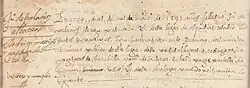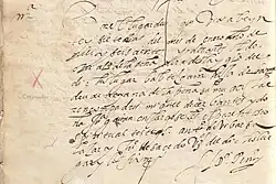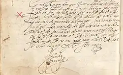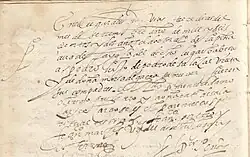 "En cinco días del mes de maio de 1595 años fallescio Juan de Palacios clérigo presvitero. Vezino deste lugar de esquivias recibió los Santos Sacramentos. Hizo su testamento ante Jeronimo de Escurieda escribano publico de este lugar dejó por su albazeas a Rodrigo Mexia y a Gaspar de Chinchilla y a Maria de Salazar Su hermana y a Gaspar Tello de Guzmán todos vezinos de este dicho lugar y mando por su anima lo siguiente..."