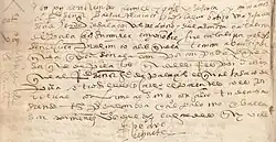 "en nueve días del dicho mes y año (abril de 1588) Babtizo el Doctor Juan Sanz Scrivano a Susana hija de Simón Hernández y de su mujer María Romana fueron conpadres Don Diego hijo de Diego García de Salazar y Doña Catalina muger de Miguel de Cervantes encargoseles el parentesto spiritual testigos Andres Martin Toledano y Francisco Marcos. El doctor Juan Sanz Escrivano".