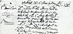 “En el Lugar de Esquivias a siete días del mes de febrero de 1599 años El Doctor Alonso de la Peña cura del dicho lugar baptizo a Bartolome hijo de Lucas Palomo y de su muger Ana Morales fue su conpadre Grabiel de Salazar y doña Catalina encargoseles el parentesco spiritual testigos Pedro Vélez el mozo y Francisco Uzeta vezinos del dicho lugar y lo firme.” El Doctor Peña.