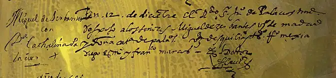 Acta: "Al margen: Miguel de Cervantes. "En diez y seys días del mes de enero de 86 yo el Licdo. Gabriel Álvarez teniente cura de S. Martin vele a Miguel de Cerbantes y a doña Catalina de Salazar fueron padrinos don pedro de ludeña y doña Magdalena de Cerbantes testigos Joan delgado Rodrigo de Cervantes pedro (enmendado) de Montes de oca, Franco de laguna y Cristobal de pena". Licdo. gabriel Álvarez.