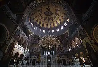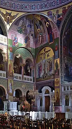 El primer iconógrafo de la iglesia fue Stephanos Almaliotis, y después de su muerte, la iconografía de la iglesia fue continuada por su asistente y alumno Anargyros Liakos, quien siguió el estilo de su maestro.[2] Almaliotis se había inspirado principalmente en la escuela macedónica, pero también en la escuela cretense, lo que dio como resultado una representación bizantina única de las figuras bíblicas.[2]