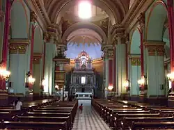 Interior del templo predominan los estilos corintio y toscano, con columnas rectangulares que sostienen los arcos y bóvedas desde el techo. Con una nave principal y dos laterales, con varias capillas cada una con un altar o vitral.