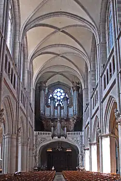 La nave tiene una altura de 27,50 m desde el suelo a la clave. Las bóvedas, cuatripartitas, tiene un esqueleto de ogivas, fajones y formeros. Los fajones y las ojivas descansan únicamente en los pilares a través de un haz de tres columnillas. Hay un triforio constituido por huecos de cuatro arcos —que corresponden con las cuatro lancetas de las ventanas altas— cuya pared de fondo es ciega, por encima del cual corre una galería alta. El muro de esta galería está perforado por una ventana dividida en dos por un parteluz central. Tres oculos. El conjunto es austero, pero destaca por la pureza de las líneas.