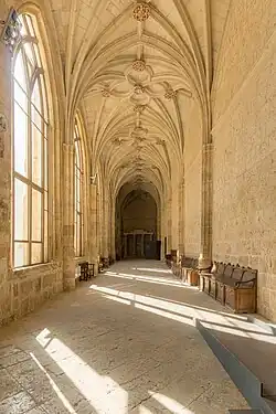 Se trata de un espacio cuadrado, con cuatro crujías techadas por bóvedas de crucería de nervios combados, de sencillo esquema tardogótico. Los nervios apean en pilares fasciculados ligeramente resaltados del muro. Hacia el interior del patio se abren arcos apuntados que debieron llevar, como es usual en estos casos, tracerías y maineles que dejaban pasar la luz. Tales arcos fueron inexplicablemente tapiados en el siglo XVII, cerrando las galerías.