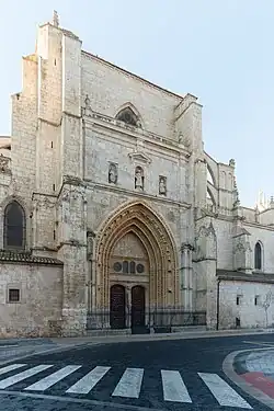 - ↑ Torres Balbás, arquitecto y arqueólogo español, opina que se trata de una obra poco hábil que rompe la armonía arquitectónica. Por su parte el historiador y arqueólogo español Díaz Pinés considera que se trata de un modelo medieval bastante difundido y que debió en este caso pertenecer a la traza palentina original