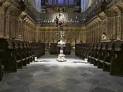 El Coro contiene dos facistoles o atriles de lecturas, uno de madera plateresco del siglo XVI y otro de bronce del siglo XVIII conocido por El Aguilón, de José Rivero (1767). El Coro está rematado por tres órganos, los dos laterales renacentistas y el central que ostenta el escudo del cabildo es barroco, de principios del siglo XVIII. Las rejas que lo cierran, como las de la Capilla Mayor y las del tránsito entre ambos y los dos púlpitos, son de finales del siglo XVII. Las rejas, con hierros abalaustrados y cilíndricos levantados sobre zócalos y coronados por frisos rematados por roleos o espirales, están dentro de la tradición de rejería extremeña iniciada por Juan Cayetano Polo.