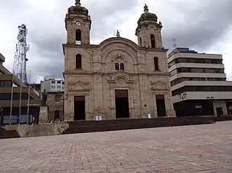 Es curioso que en la fachada (planos del Padre Orjuela) se haya mezclado, como se observa en los copulines en que rematan las torres, el estilo característico de las Iglesias ortodoxas rusas.