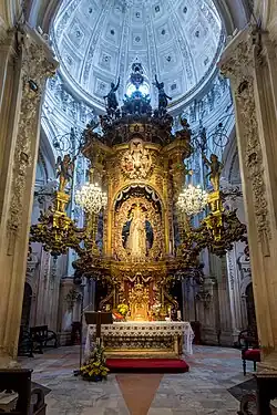 En las columnas de la sección alta, próximas a la cabecera, hay sendas cartelas en que lee: GOVERNANDO LA IGLESIA DE DIOS NUESTRO MVY SANTO PADRE VRBANO VIII SIENDO OBISPO DESTE SANTA IGLESIA EL ILUSTRISIMO DON ALFONSO LOPEZ GALLO (en la meridional), y REINANDO EN ESPAÑA LA MAGESTAD DE LOS REYES DON FELIPE IV Y DOÑA ISABEL DE BORBON (en la septentrional).