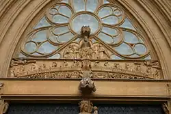 En el tímpano se representa el Juicio Final, presidido por Cristo con dos ángeles portadores de los atributos de la Pasión, con tracerías superiores para la inserción de un vitral, realizado por Jaume Cascalls y su taller hacia el año 1375, contratado por el obispo Pere de Clasquerí, así como el friso con la representación de los escogidos y los condenados.[21]​ En la parte interior del templo que corresponde al tímpano están representadas la Virgen entre san Pablo y santa Tecla con dos ángeles ceroferarios.