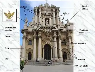 - La presencia de dos volutas curvilíneas de los laterales sirven para dar movimiento a la parte superior de la fachada y unificarla al conjunto.